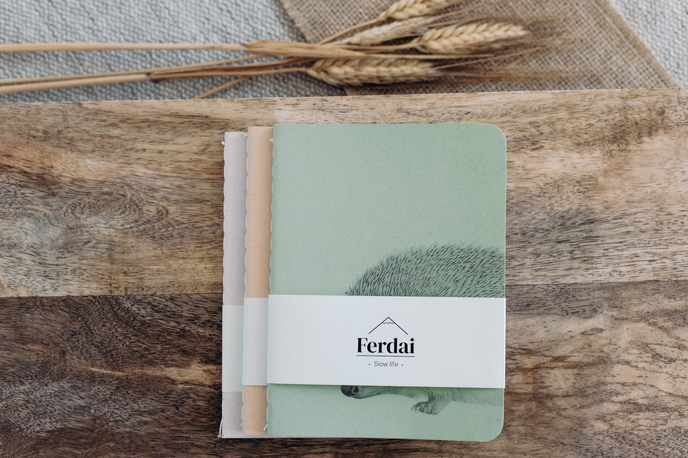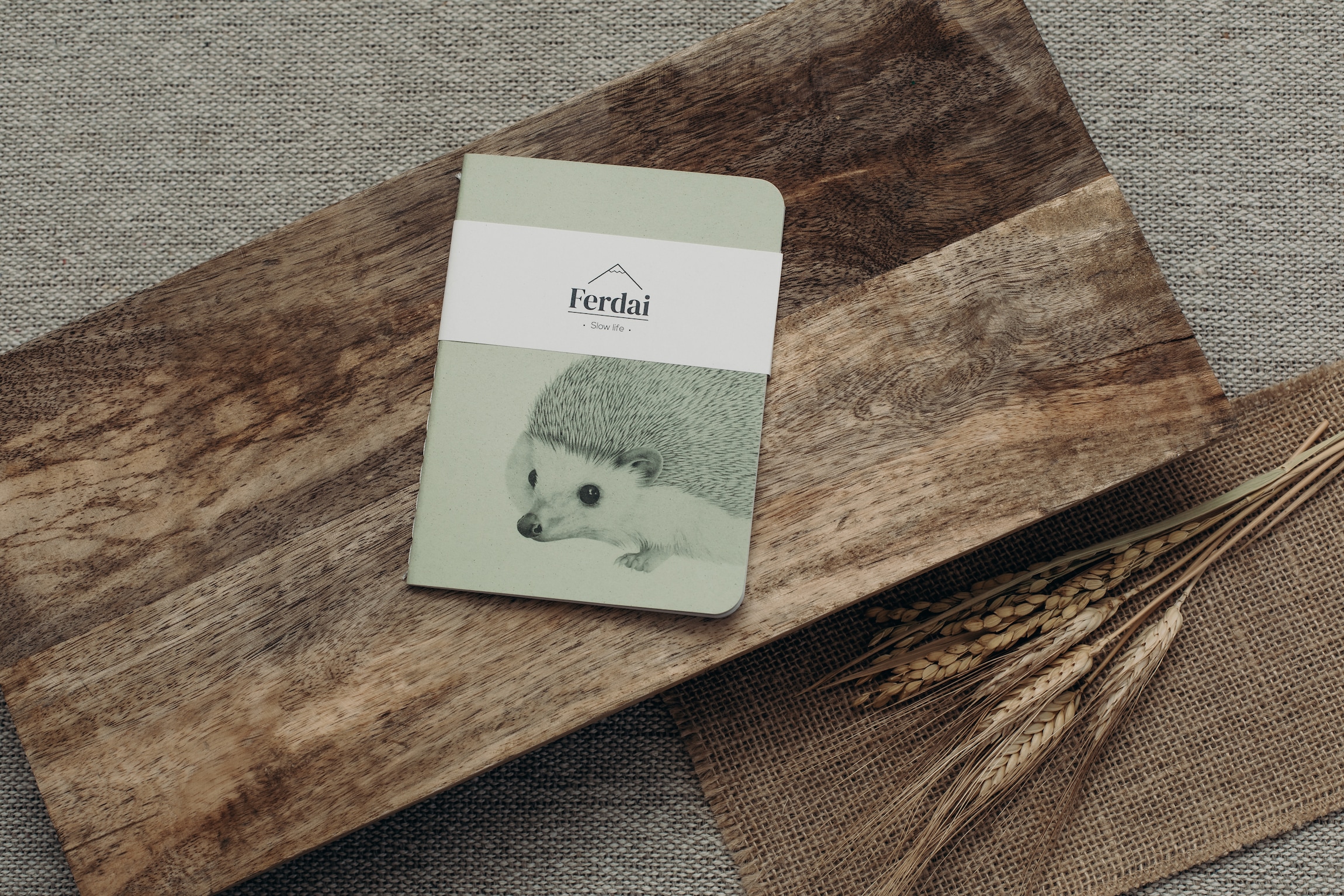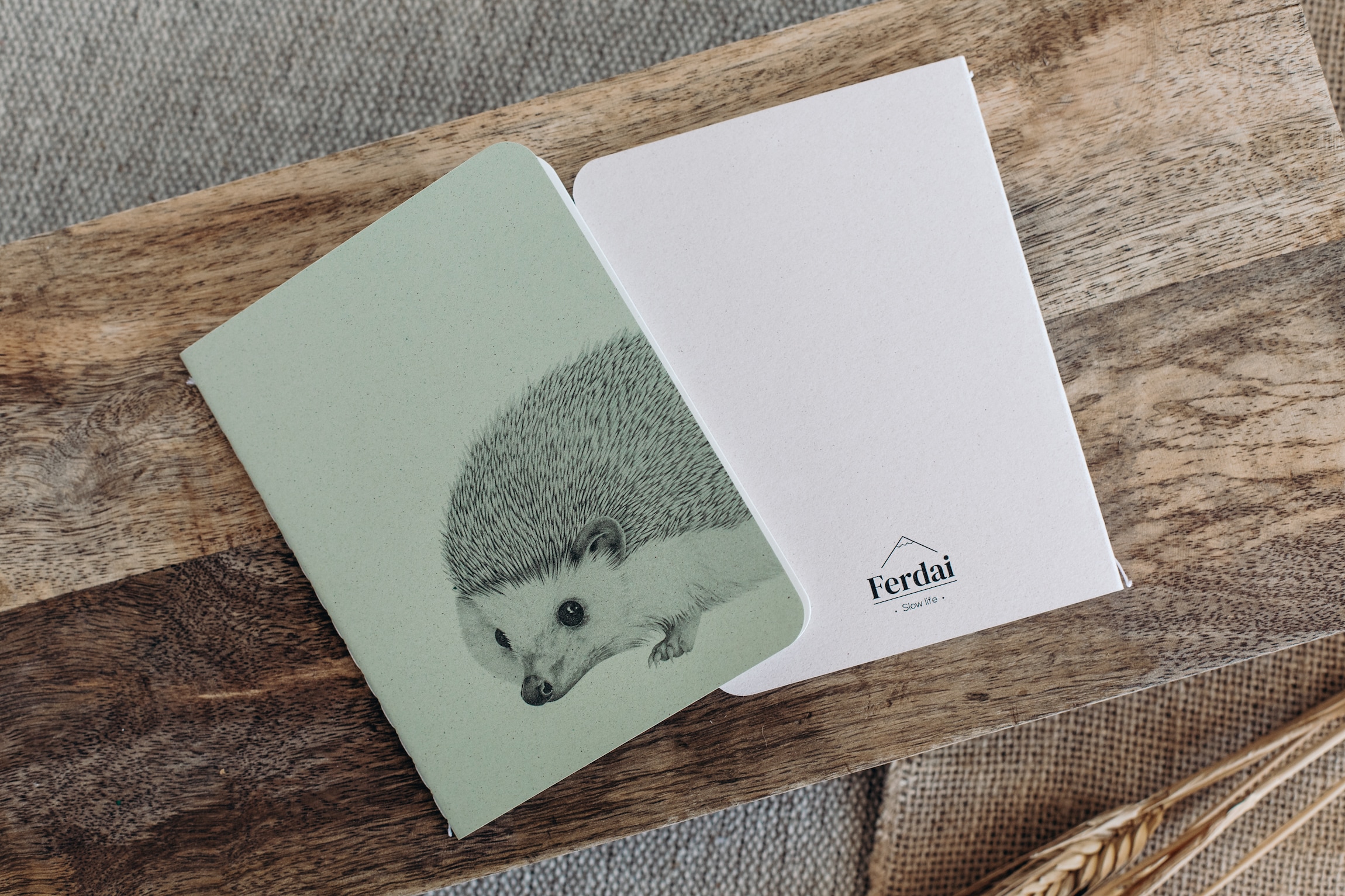 Libreta tamaño bolsillo con medida A6 (10,5 x 14 cm) con cubierta color KIWI impresa con ilustración erizo en tinta gris, cosido con hilo visto en blanco, bordes redondeados y logo impreso en contraportada. 48 páginas blancas. Viene con faja colocada en papel reciclado.